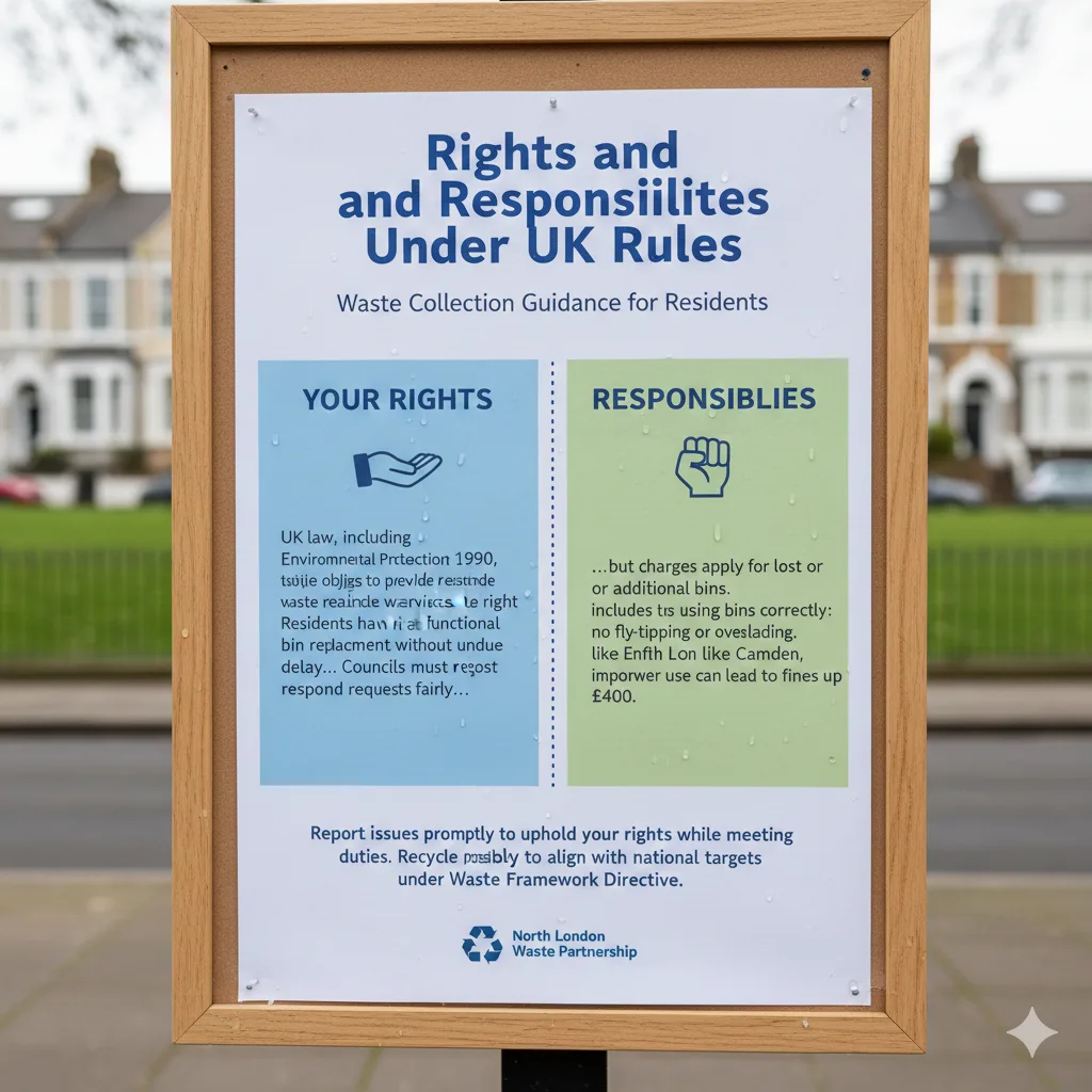 UK law, including the Environmental Protection Act 1990, obliges councils to provide reasonable waste collection services. Residents have the right to a functional bin replacement without undue delay.