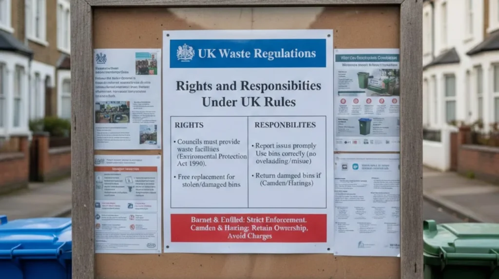 UK law places responsibility on councils to provide adequate waste facilities under the Environmental Protection Act 1990. Residents have the right to free replacements for stolen or council-damaged bins in most cases.