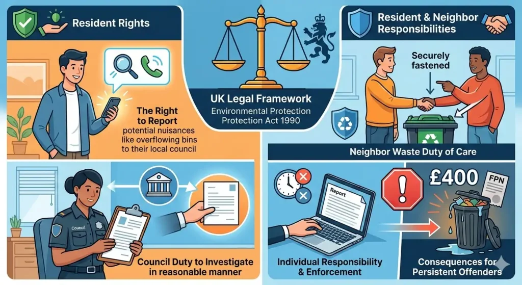 Residents have the right to report without fear of reprisal, and councils must act reasonably—issuing warnings or abatement notices if needed. Neighbours must comply with waste duty of care rules, preventing overflow.