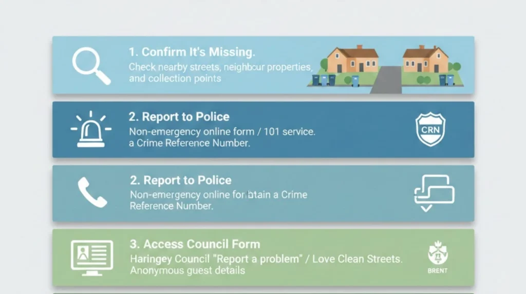 To report a stolen wheelie bin in Haringey anonymously, use the council’s online reporting form via their “Report a problem” service or the Love Clean Streets platform, selecting the guest option to stay anonymous. First confirm it’s stolen, then report to police non-emergency (101 or online) for a crime reference number before contacting the council for a replacement. This process applies similarly across North London councils like Brent, Barnet, Enfield, Camden, Haringey, and Islington.