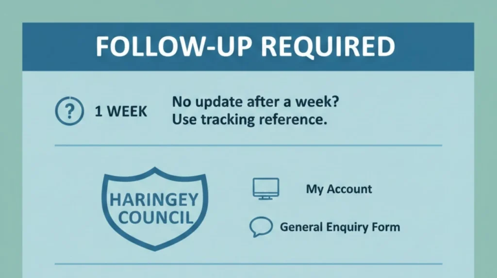 If no update arrives after a week, use the council’s tracking reference from your initial report. For Haringey, log into My Account or contact the waste team via their general enquiry form.