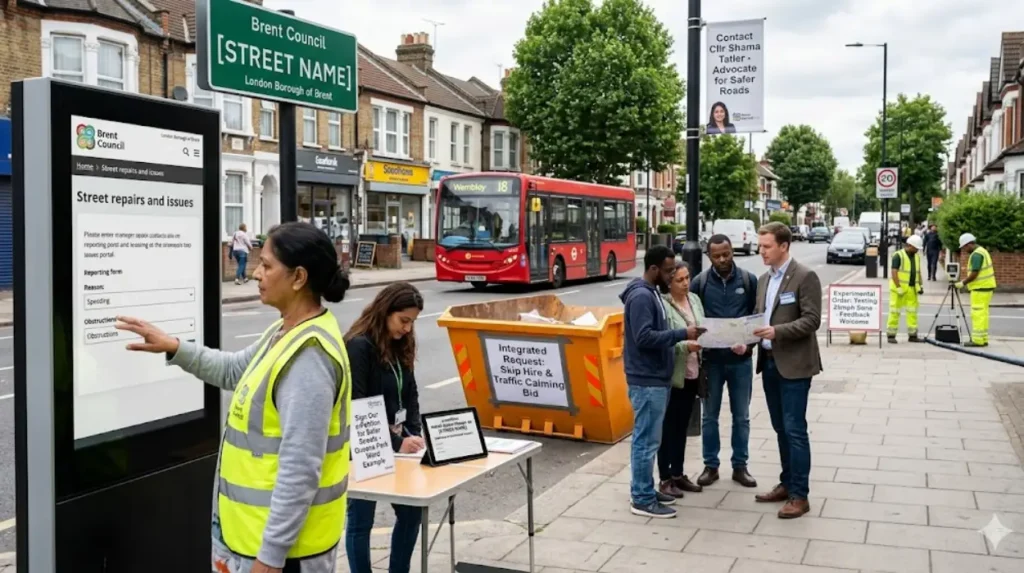 Pair skip requests with formal calming bids to amplify impact. Report concerns through Brent’s “Street repairs and issues” portal, selecting speeding or obstructions to trigger speed surveys and data collection—essential for TfL-funded humps. Gather neighborhood support via e-petitions on Brent’s democracy site, as seen in Queens Park Ward’s call for cameras and restrictions. Contact Highways Committee members like Councillor Shama Tatler for advocacy.
