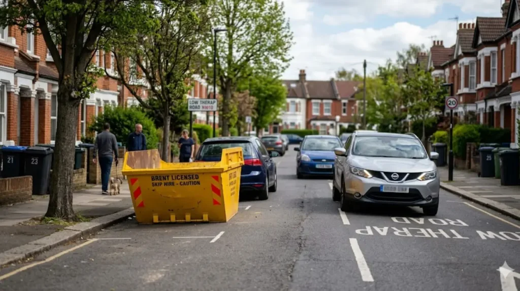 To request a traffic calming skip, applicants must navigate Brent’s highways rules, as skips on public roads require council approval to avoid fines or removal. Crucially, only registered skip companies can apply; residents and builders cannot, ensuring professional compliance with lighting, signage, and positioning mandates. The skip must not block junctions, bus stops, or emergency access, and requires public liability insurance, waste carrier licences, and transfer notes.